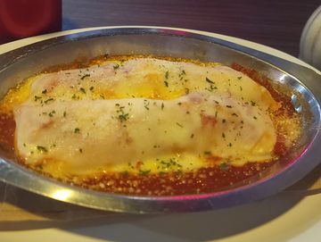 Eggplant rolled and baked with seasoned ricotta cheese, ham, romano cheese, and tomato sauce topped with mozzarella cheese till golden brown