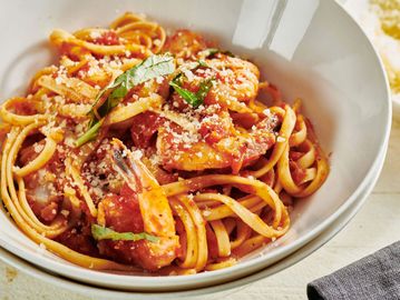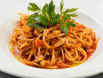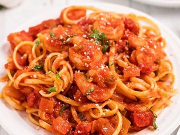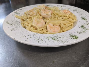 Sauteed shrimp in olive oil and garlic in a light marinara sauce tossed with linguini pasta