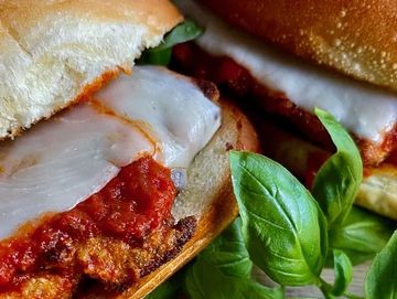 Chicken breast, egged and breaded, deep fried, topped with mozzarella cheese, and baked with seasoned tomato sauce