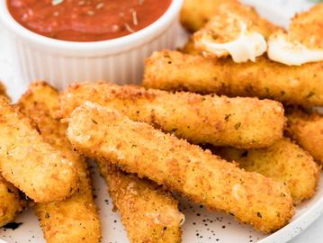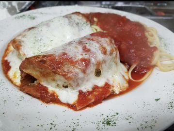 Eggplant, egged and breaded, deep fried, topped with mozzarella,lla cheese and baked Served Over Marinara Sauce