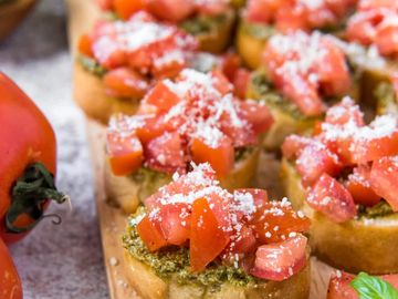 Sliced Toasted Homemade Italian Bread With Diced Roma Tomatoes, Garlic, Basil, And Extra Virgin Olive Oil.