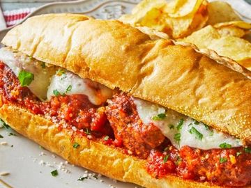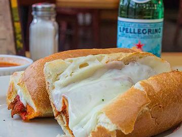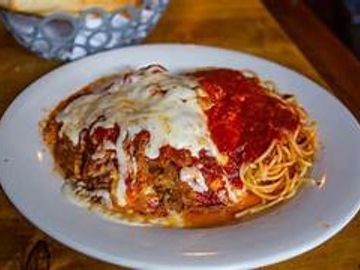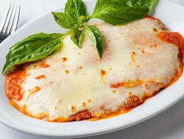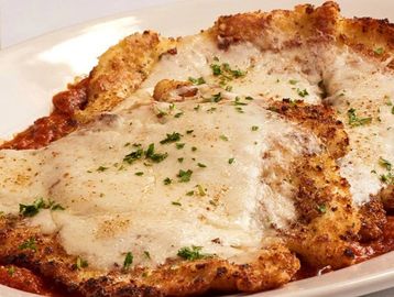 Veal cutlet, egged and breaded, deep fried, topped with mozzarella cheese, and baked and Served Over Marinara Sauce