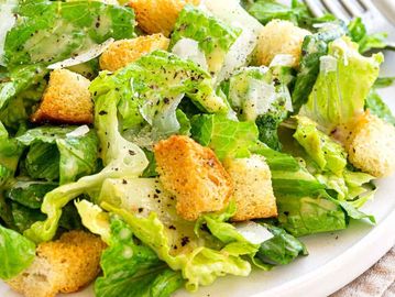 Hearts of romaine lettuce with homemade croutons topped with shaved Parmesan cheese in a homemade Caesar dressing